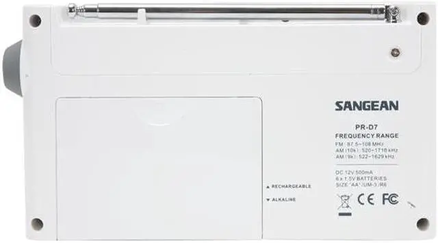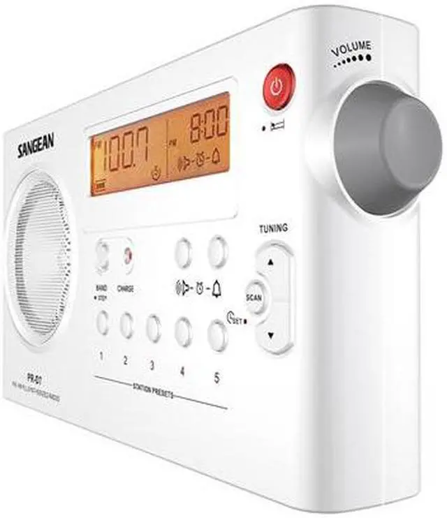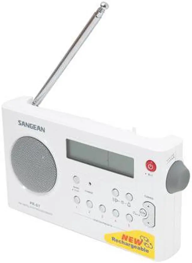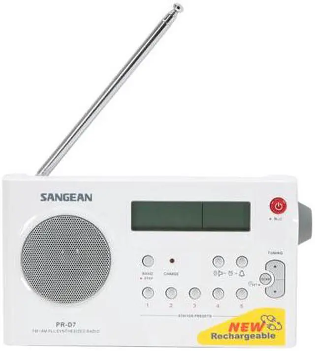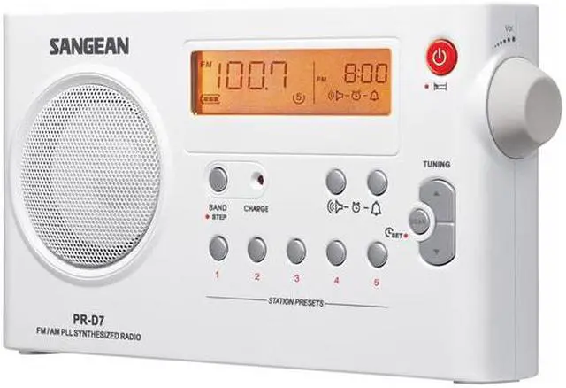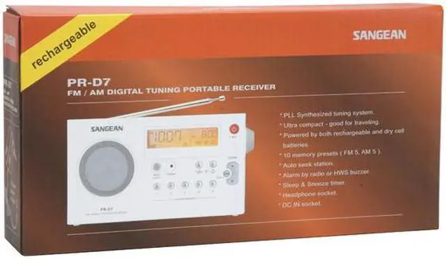 Sangean PRD-7 Digital AM/FM Portable RadioFully PLL-synthesized tuning systemCompact design for travel10 memory station presets--5 AM/5 FMRotary volume controlAuto seekWake to radio or buzzerSnooze timerHeadphone outputWhiteDigital AM/FM Portable Radio