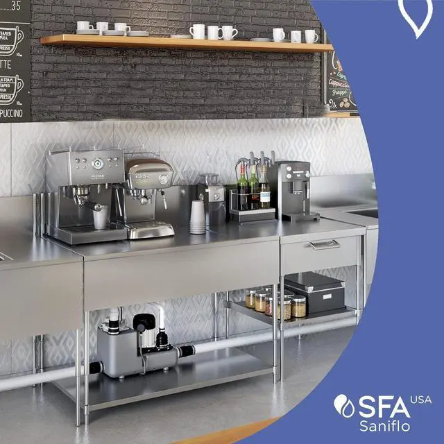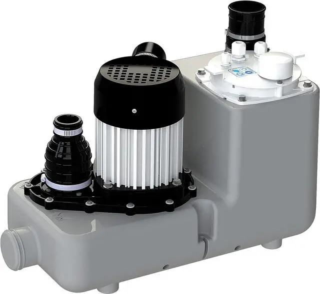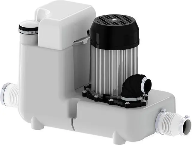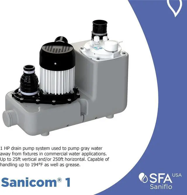 The Sanicom 1 drain pump is used to pump gray water away from a variety of fixtures in commercial and residential applications. The system is able to discharge the waste up to 25 feet vertical and/or 250 feet horizontal. This model was designed to sustain the toughest applications from commercial applications where hot water can be an issue as it is capable of handling up to 194°F.