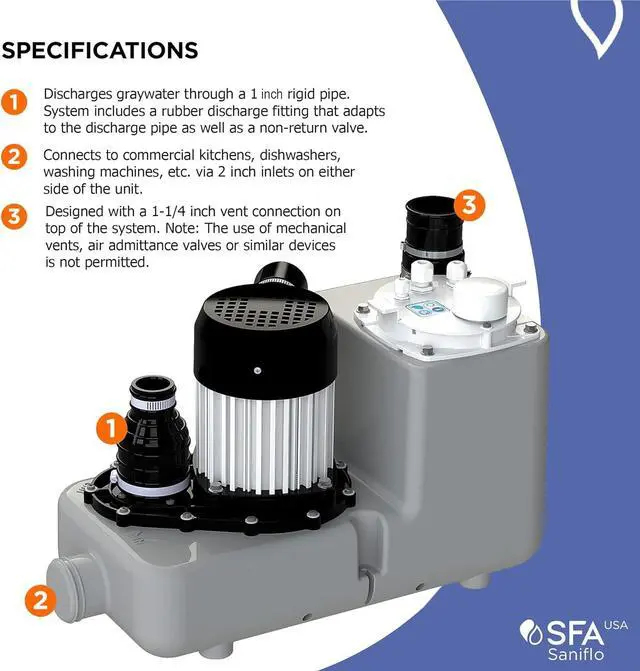 This unit has been designed with a vent connection on top of the enclosure. All plumbing codes require connection to a vent system. Please note that the vent system should be a two-way air vent. The use of mechanical vents, air admittance valves or similar devices are not permitted as these are considered one-way air vent systems.