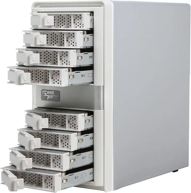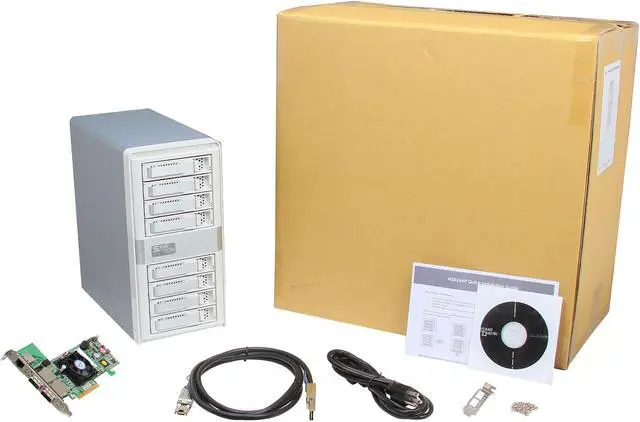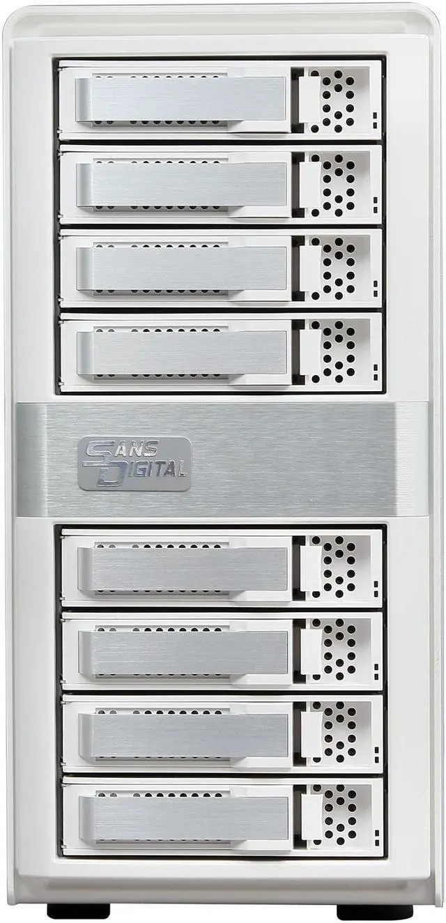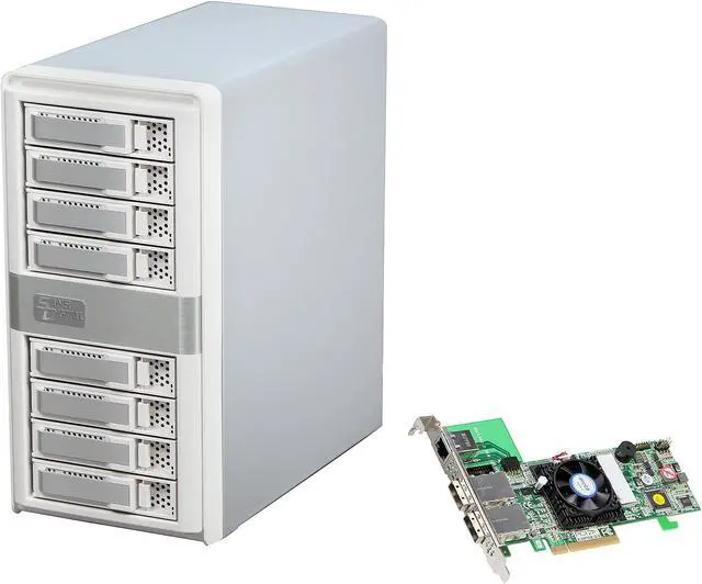 The MobileSTOR MS8X6HP is an 8 bay 6G RAID storage tower for high capacity storage solutions. The MS8X6HP is bundled with a high-performance RAID controller card that offloads complicated RAID calculations from the computer or the enclosure to the dedicated RAID engine. High performance can be achieved with a lower cost of ownership compared to RAID embedded subsystems. RAID setup and maintenance can be controlled via built-in Web Browser interfaces, and the unit is supportive of e-mail notifications and SNMP trap. Utilizing high bandwidth 2400MB/s mini-SAS (SFF-8088) cabling, the MS8X6HP supports SAS or SATA hard drives to deliver superior read / write speeds that are crucial in performance-driven environments such as the video editing industry. The mini-SAS connection combines eight hard drive connections into single cables, reducing possible points of failures while preserving uninterrupted data transfer. A built-in SAS expansion port enables the system to connect up to 8 units or 64 HDD drives daisy-chained together. All necessary hardware comes standard including the mini-SAS cable, hard drive tray modules and bundled RAID controller card. The MS8X6HP also supports SATA drives, allowing users the option to choose between high performance and high capacity storage solutions.