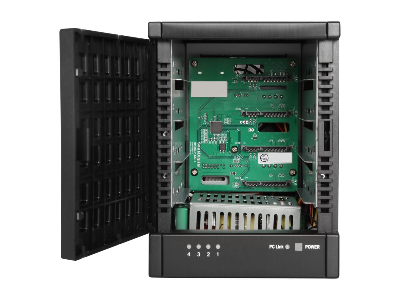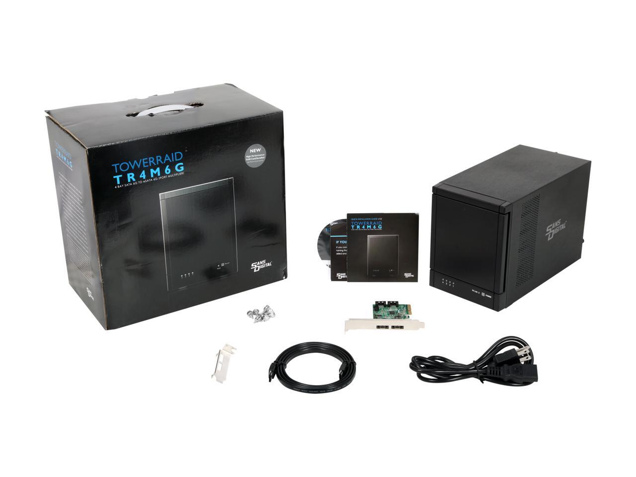 SANS DIGITAL TowerRAID TR4M6G RAID 0, 1, 10, 5, 5+spare, Spanning and JBOD (via Bundled RR642 RAID Controller Card) 4 x Hot-Swappable 3.5" Drive Bays eSATA (via 6G Port Multiplier) 4-Bay eSATA 6G Port Multiplier RAID Tower w/ 6G PCIe Card