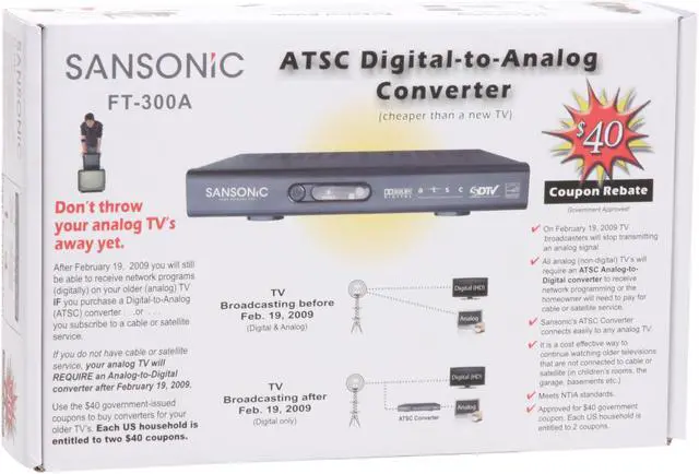 | Features | Receiving and Presenting Audio/Video Formats Contained in ATSC A / 53E Supports 4:3 and 16:9 Video Format Process and Display ATSC A/65C Program and System Information Protocol data Receiving RF Channels 2 through 69 inclusive Compliant with ATSC A / 74 Receiver Performance Guidelines Supports Channel Display, Closed Captioning, EAS and Parental Control(V-Chip) Complaint with Energy Standards Display ANT Level and Signal quality on the TV |