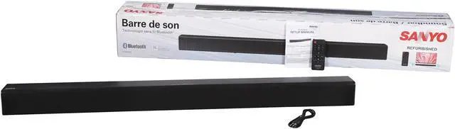 | Features | 2-channel soundbar Bluetooth v 4.1 for music streaming Treble / bass control Total 26W (13W x 2 RMS) AUX-in Analog audio RCA type L/R-in Digital optical-in 3.5mm stereo line-in Sanyo soundbar is ideal for any home theater system |