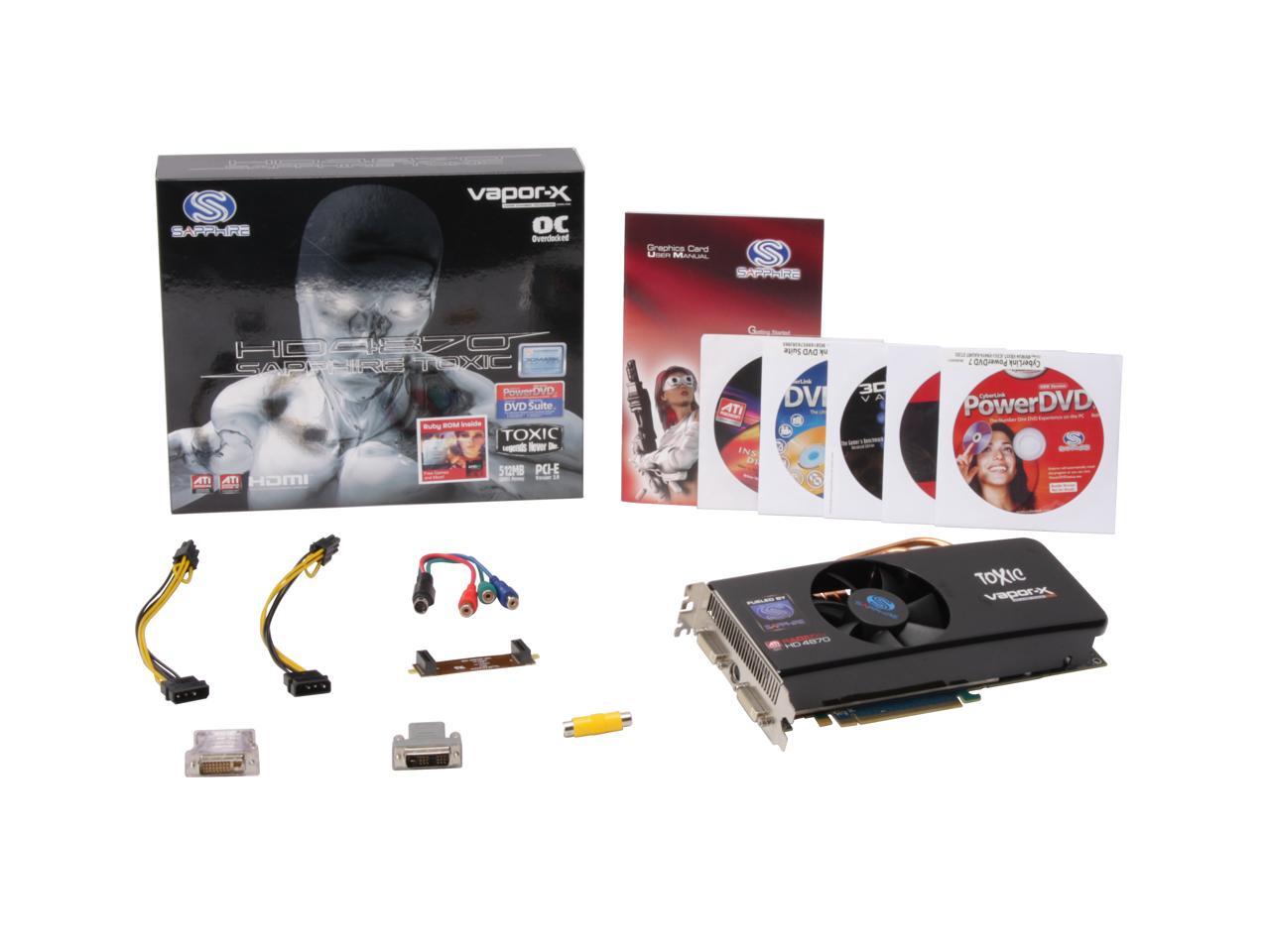 | Package Contents | 100243TXSR Driver Disk Software Disk User's Manual HDTV Cable Power Cable DVI to VGA/D-sub Adapter DVI to HDMI Adapter CrossFire Bridge S-Video to Composite Adapter |