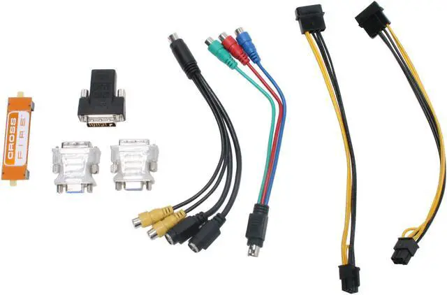 | Package Contents | 100214SR Driver Disk User Manual HDTV Cable VIVO Cable 2 x Power Cable 2 x DVI to VGA/D-sub Adapter DVI to HDMI Adapter CrossFire Bridge |