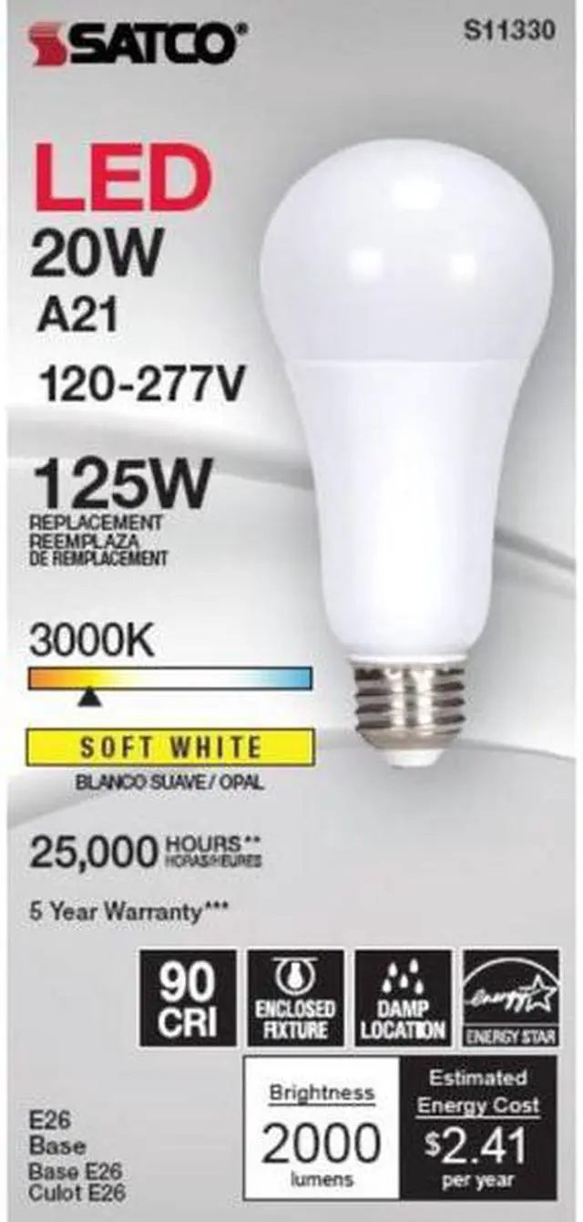 SATCO S11330 Bulb,LED,20W,A21,120V-277V,30K,E26,No Dim,White
