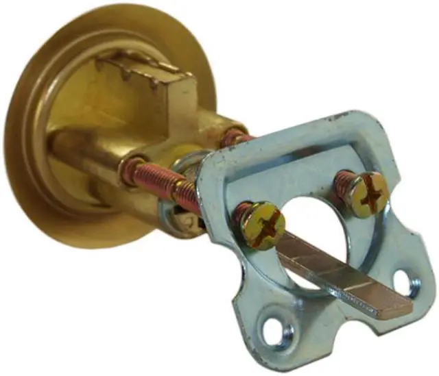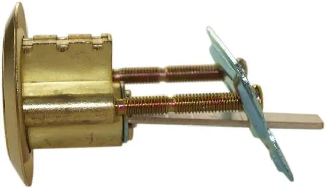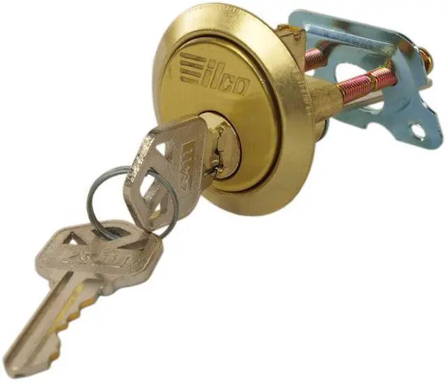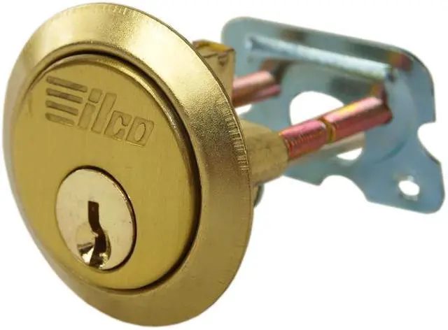 Ilco 605-04-51 Zinc Die Cast With Brass Finish Rim Cylinder Lock, For Doors 1-1/4" - 2-1/4" Thick, With Kwikset KW1 Keyway, specially designed for indoor and outdoor use. This is an ideal replacement for all standard size cylinders for rim deadlocks, night latches, and garage door locks. This cylinder features a 5 pin tumbler, and it is keyed different, with Kwikset KW1 keyway. Includes a rim cylinder, a trim ring, a mounting plate, and screws.