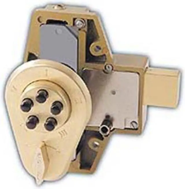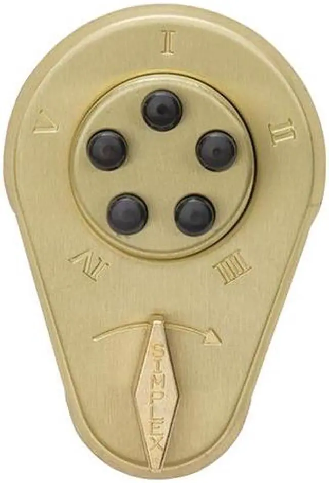 Simplex 904-04 Satin Brass Heavy Duty Mechanical Pushbutton Combination Lock With 1" Deadbolt And Angle Strike, specially designed to provide mechanical access by combination, while allowing free egress at all times by interior thumbturn. This deadbolt does not relock by itself, it has to be manually relocked. This mechanical lock eliminates material and labor expense of battery replacements, and it has a single access code which is programmed via the keypad without removing the lock from the door. This lock has a 2-9/16" inch backset for outswing doors, or a 2-1/2" inch backset for inswing doors, a 1" inch deadbolt, and an angle strike. This lock fits doors 1-3/4" to 2-1/8" thick. This lock is constructed of cast front housing, force resistant, clutch protected thumbturn, and a metal exterior trim plate.