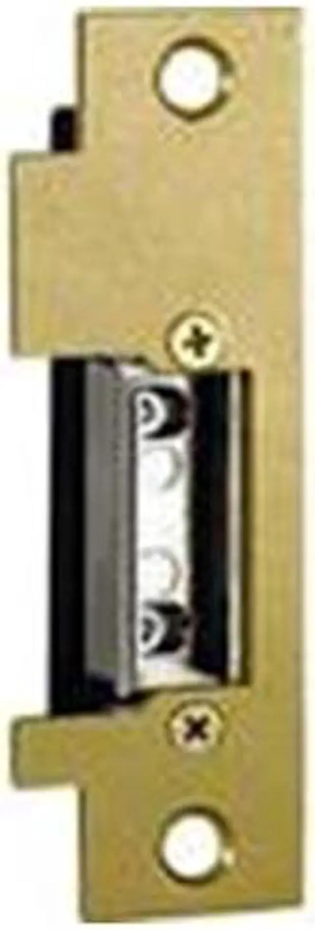 Trine 2009 Brass Powder Coated Electric Door Strike With Adjustable Latch, specially designed as a replacement installation for metal jambs. This strike features 16 - 24 Volt AC/DC, a narrow style 1-1/4" x 4-7/8" face plate, a mortise backset of 1-9/16", a cavity depth of 9/16", a cavity width of 5/8" and a cavoty height of 1-11/16. The centerline of the latch is 3/8" inches below ANSI centerline for offset applications. This stike fits a standard 4-7/8" ANSI prep with little jamb modification, and it should be used with locksets having up to a 5/8" throw based on a 1/8" door gap.