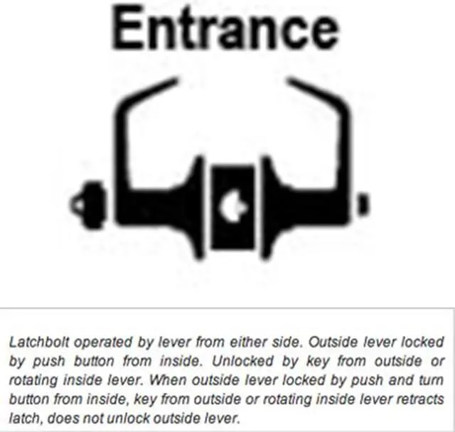 Entrance: Latchbolt operated by lever from either side. Outside lever locked by push button from inside. Unlocked by key from outside or rotating inside lever. When outside lever locked by push and turn button from inside, key from outside or rotating inside lever retracts latch, does not unlock outside lever.