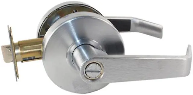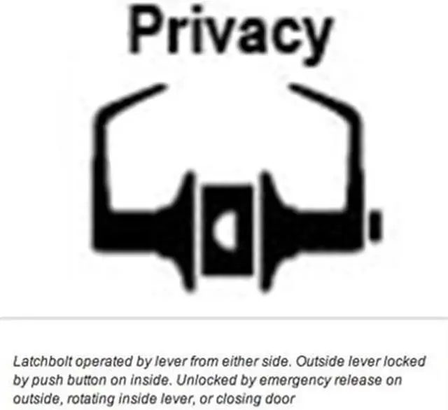 Privacy: Latchbolt operated by lever from either side. Outside lever locked by push button on inside. Unlocked by emergency release on outside, rotating inside lever, or closing door.