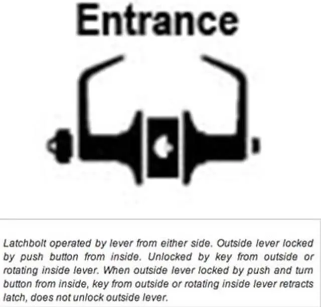 Entrance: Latchbolt operated by lever from either side. Outside lever locked by push button from inside. Unlocked by key from outside or rotating inside lever. When outside lever locked by push and turn button from inside, key from outside or rotating inside lever retracts latch, does not unlock outside lever.