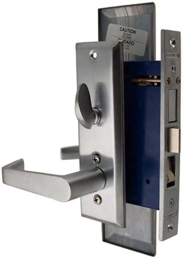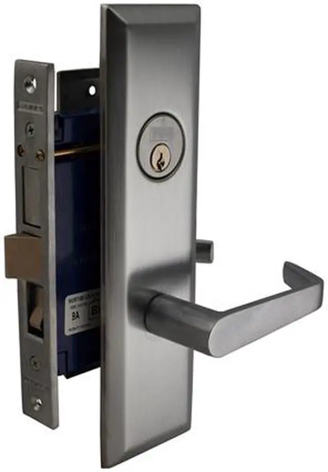 face plate: 1-1/16" x 7-5/8". Cylinder on outside and thumb turn on inside. Thru-bolted screwless lever plate assemblies Lock Set. Independent spring loaded captivated spindles. Lever support springs. This ADA approved handicap Marks USA silver escutcheon plates and levers enhance the look of the door. Commercial Mortise Locksets.