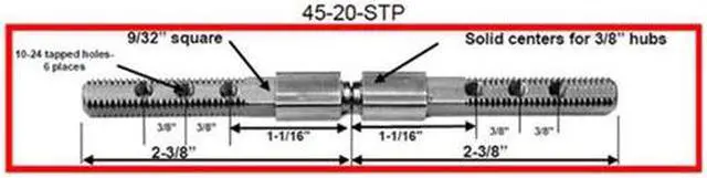Progressive 45-20-STP Replacement Steel Swivel Spindle, designed with a 9/32" inch square by 4-3/4" inch long, threaded 3/8"-20 threads per inch With two 3/8" solid centers and tapped holes on both ends. This spindle is an ideal replacement for Surface Mount Mortise Locksets.