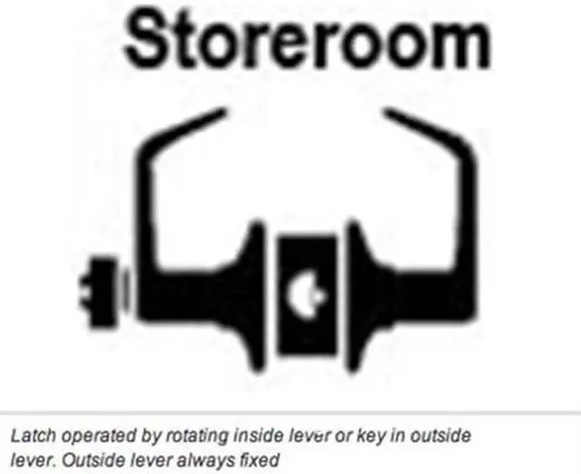 Storeroom: Latch operated by rotating inside lever or key in outside lever. Outside lever always fixed.