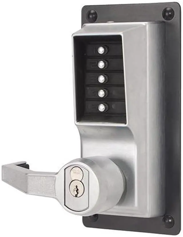 Simplex LP1020S-LH-26D-26D Satin Chrome US26D Mechanical Pushbutton Combination Exit Trim Left Hand Lock With Lever For a Schlage Large Format Interchangable Core (LFIC), specially designed to provide exterior access by combination, while allowing free egress with Exit Devices (Exit Devices not included). This mechanical lock eliminates material and labor expense of battery replacements, and it has a single access code which is programmed via the keypad without removing the lock from the door. This lock has a 2-3/4" tailpiece for exit device operation from outside, and it has an optional 5" tailpiece for freezer doors (sold separately part# 744773-000-01), and it fits wood or metal doors, 1-3/8" to 2-1/4" thick. This lock has a 3-hour UL/ULC fire rating for "A" label doors. This lock is constructed of a heavy duty cast front housing, a heavy duty mounting plate, and a fixed ADA-compliant levers.