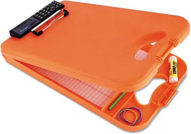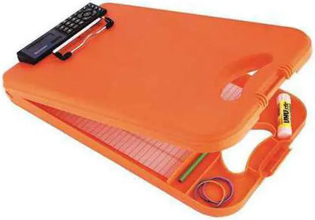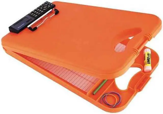 A complete mobile officeeven includes a handy calculator. Calculator is powered by solar/ battery. Has easy-to-read LCD screen. Easy-access bottom opening and large internal storage compartment. Low-profile clip has integrated rubber grip pads. Now made in the USA by blind Americans. Holds Paper Size: 8 1/2 x 12; Clipboard Actual Size: 10w x 2 5/8d x 16h; Clipboard Material: Polypropylene.