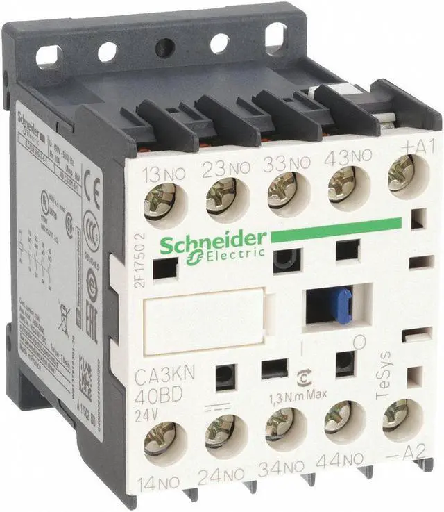 IEC Control Relay, Current Rating 10 A, Contact Form 4NO, Contact Rating (DC) 2 A @ 125/250/600V, Coil Voltage 24V DC, Contact Rating (AC) 10 A @ 120/240/480/600V, Relay Style IEC, Electrical Connection Screw Clamp, Mounting Style DIN Rail and Surface, Power Consumption 3 W, IP Rating IP2X, Compatible with Series TeSys K Control Relays, Maximum Operating Temperature 122 Degrees F, Body Depth 2.24 in, Body Height 2.28 in, Body Width 1.77 in, Contact Material Silver Nickel, Input Voltage 24V DC. This item has been restricted from sale in the following state (s): []