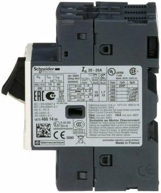 Manual Motor Starter, NEMA Size Not Applicable, Horsepower @ Single Phase - 120V AC 2 hp, Horsepower @ Single Phase - 240V AC 3 hp, Maximum Voltage Rating 690V AC, Number of Poles 3, Operator Push Button, Phase Three, Current AC 25 A, Horsepower @ Three Phase - 208V AC 5 hp, Horsepower @ Three Phase - 240V AC 7 1/2 hp, Horsepower @ Three Phase - 480V AC 15 hp, Series TeSys Deca, Horsepower @ Three Phase - 600V AC 20 hp, Maximum Overload Relay Current Setting 25 A.