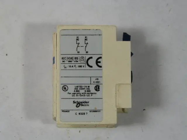 Auxiliary Contact Block, Current AC 10 A, Number of Contacts 2, Mounting Front, Number of Normally Open Contacts 0, Maximum Voltage Rating 690V AC, Number of Normally Closed Contacts 2, Terminal Connection Type Screw Clamp Terminals, Compatible with Series TeSys, TeSys Deca, TeSys F, IP Rating IP20. This item has been restricted from sale in the following state (s): []
