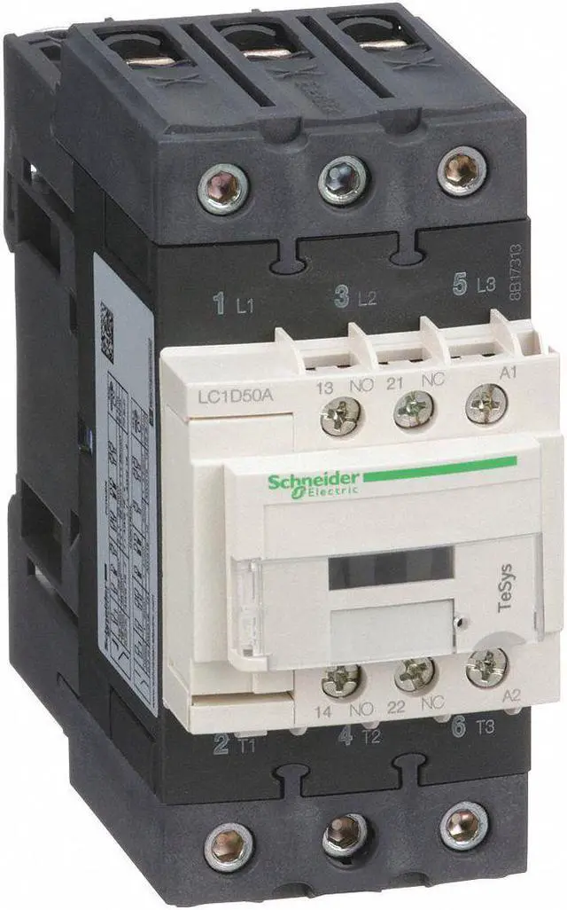 TeSys Deca contactor, 3 poles (3NO), for motor control applications up to 50A/440V AC-3/3e (22kW@400V). They can be used to create motor starters for almost any type of application. It provides a 120V 60Hz AC coil, 1NO+1NC built-in auxiliary contacts (NC mirror certified), power connection by EverLink BTR screw connectors, control connection by screw clamp terminals. For operating rates until 3600 cycles/hour and environments until 60°C, it procures high reliability and durability. Compact (55mm width), DIN-rail mounting or screw fixing. Contactor is rated for 15HP at 200 to 208VAC, 15HP at 240VAC, 40HP at 480VAC and 40HP at 600VAC three phase. Multi standards certified (IEC, UL, CSA, CCC, EAC, Marine). When used with a 480VAC up to 110A circuit breaker, this contactor can have a SCCR up to 100kA. When used with up to a 600VAC 110A Class J or CC fuse, this contactor can have a SCCR up to 100kA. Contactor is supplied with a 120 VAC 60 Hz coil. Contactor has one normally open and one normally closed auxiliary contact built-in as standard. The NC contact is mirror certified. Screw clamp terminals are used for load and auxiliary connections. An extensive line of accessories makes it easy to meet the requirements of most applications. The contactor is 4.80 inches tall, 2.17 inches wide and 4.72 inches deep. It weighs 1.87 lbs. Contactor is certified to UL, CSA, IEC, CCC, EAC and Marine standards.