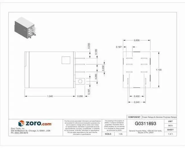 General Purpose Relay, Base Shape Square, Coil Voltage 120V AC, Contact Form DPDT, Current Rating 15 A, Electrical Connection Quick-Connect, Flat Pin Width 0.18 in, Number of Pins 8, Pin Shape Flat, Sealing Enclosed, Status Indicator LED Indicator, Mechanical Flag, Contact Rating (AC) 15 A @ 277V, Contact Rating (DC) 15 A @ 28V, Horsepower @ 120V AC Not Rated, Horsepower @ 240V AC Not Rated, Mounting Style Plug-In, Push-To-Test Method Lockable, Body Depth 1.54 in, Body Height 1.06 in.