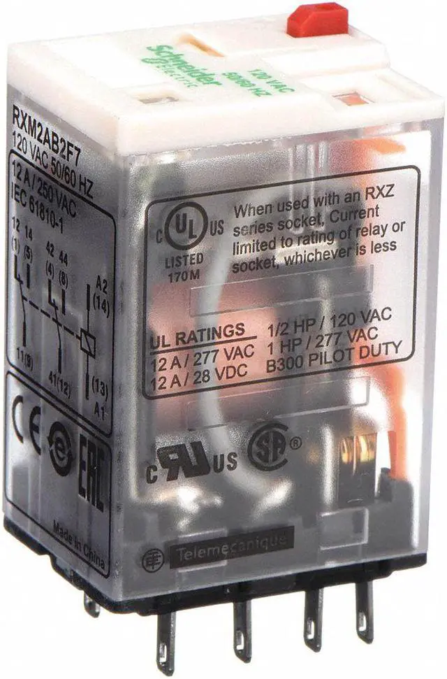General Purpose Relay, Base Shape Square, Coil Voltage 120V AC, Contact Form DPDT, Current Rating 12 A, Electrical Connection Quick-Connect, Flat Pin Width 0.09 in, Number of Pins 8, Pin Shape Flat, Sealing Enclosed, Status Indicator LED Indicator, Mechanical Flag, Contact Rating (AC) 12 A @ 250V, Contact Rating (DC) 12 A @ 28V, Horsepower @ 120V AC Not Rated, Horsepower @ 240V AC Not Rated, Mounting Style Plug-In, Push-To-Test Method Lockable, Body Depth 1.57 in, Body Height 1.06 in.