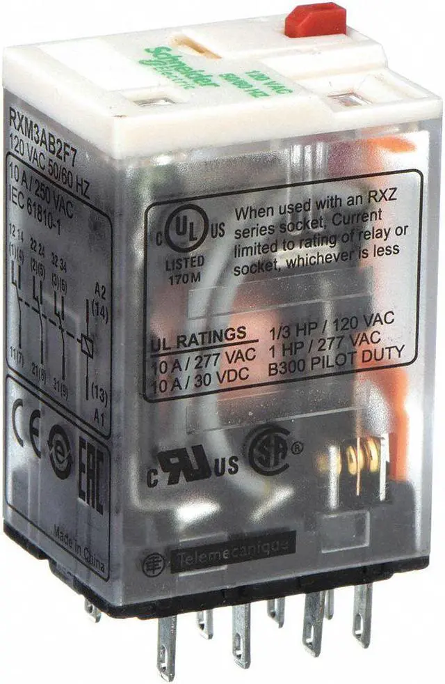 General Purpose Relay, Base Shape Square, Coil Voltage 120V AC, Contact Form 3PDT, Current Rating 10 A, Electrical Connection Quick-Connect, Flat Pin Width 0.09 in, Number of Pins 11, Pin Shape Flat, Sealing Enclosed, Status Indicator LED Indicator, Mechanical Flag, Contact Rating (AC) 10 A @ 250V, Contact Rating (DC) 10 A @ 28V, Horsepower @ 120V AC Not Rated, Horsepower @ 240V AC Not Rated, Mounting Style Plug-In, Push-To-Test Method Lockable, Body Depth 1.57 in, Body Height 1.06 in.