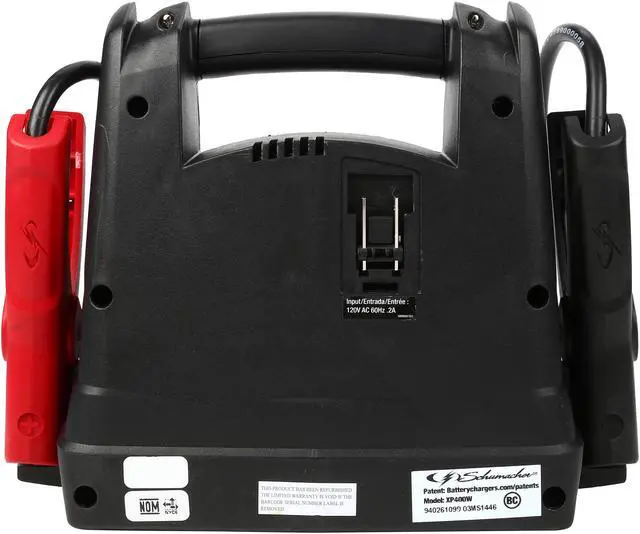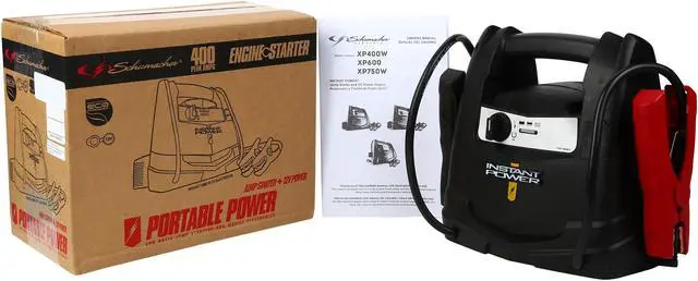| Features | JUMP STARTER + 12V POWER FOR BASIC JUMP STARTING AND MOBILE ELECTRONICS 400 peak amps - power for jump starting vehicles in emergencies Works with any device powered or charged by 12V power ports Sealed lead-acid AGM battery ON/OFF switch Hook-up safeguard alarm - alarm sounds if clamps are improperly connected to battery LED indicators - for internal battery status 8-gauge cables with spark-resistant clamps that fit both top- and side-post batteries SEenergy-efficient eco charger for internal battery (extension cord not included) Contents: (1) Schumacher XP400W with cables (1) owner's manual |