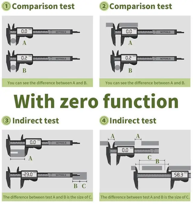 Clamp A with a caliper, press the reset button to reset to zero, and then test B, you can test the size difference between A and B.