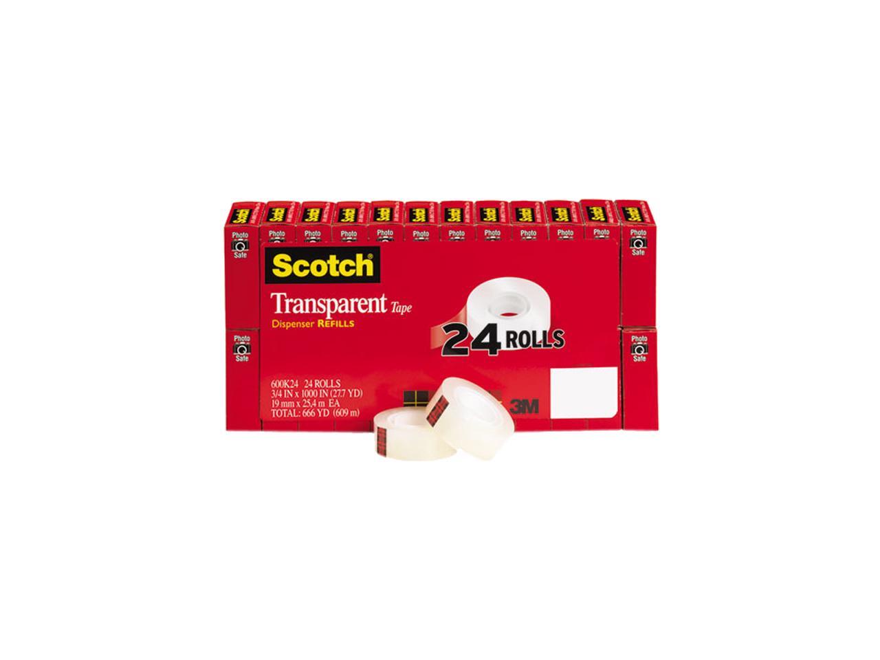 Scotch 600K24 Transparent Glossy Tape, 3/4" x 1000", 1" Core, Clear, 24/Pack