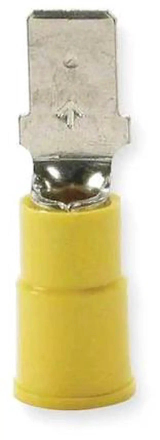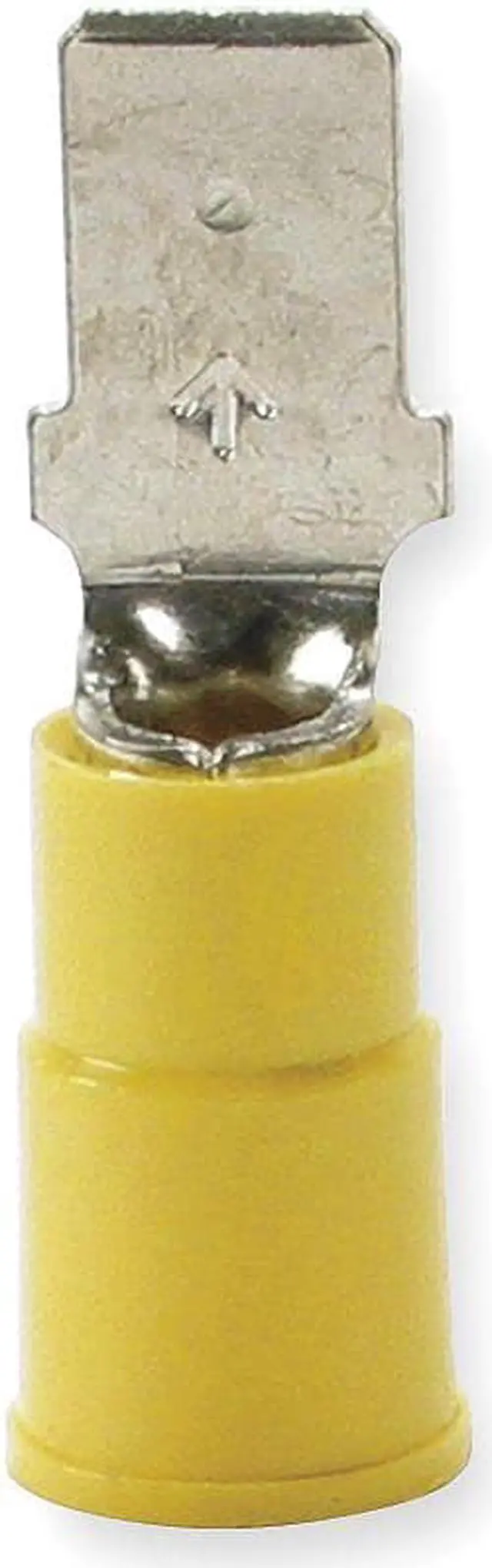 Male Disconnect, Contact Material Copper, Insulation Color Yellow, Insulation Coverage Partial Coverage, Maximum Operating Temperature 221 Degrees F, Minimum Wire Size 12 AWG, Maximum Wire Size 10 AWG, Maximum Voltage 600 V, Tab Thickness 0.032 in, Tab Width 0.25 in, Terminal Type Male Disconnect, Termination Style Crimp, Seam Style Butted, Standards CSA Certified, RoHS Compliant, UL Listed, Barrel Inside Diameter 0.15 in, Overall Length 1.05 in, Package Quantity 50. This item has been restricted from sale in the following state (s): []