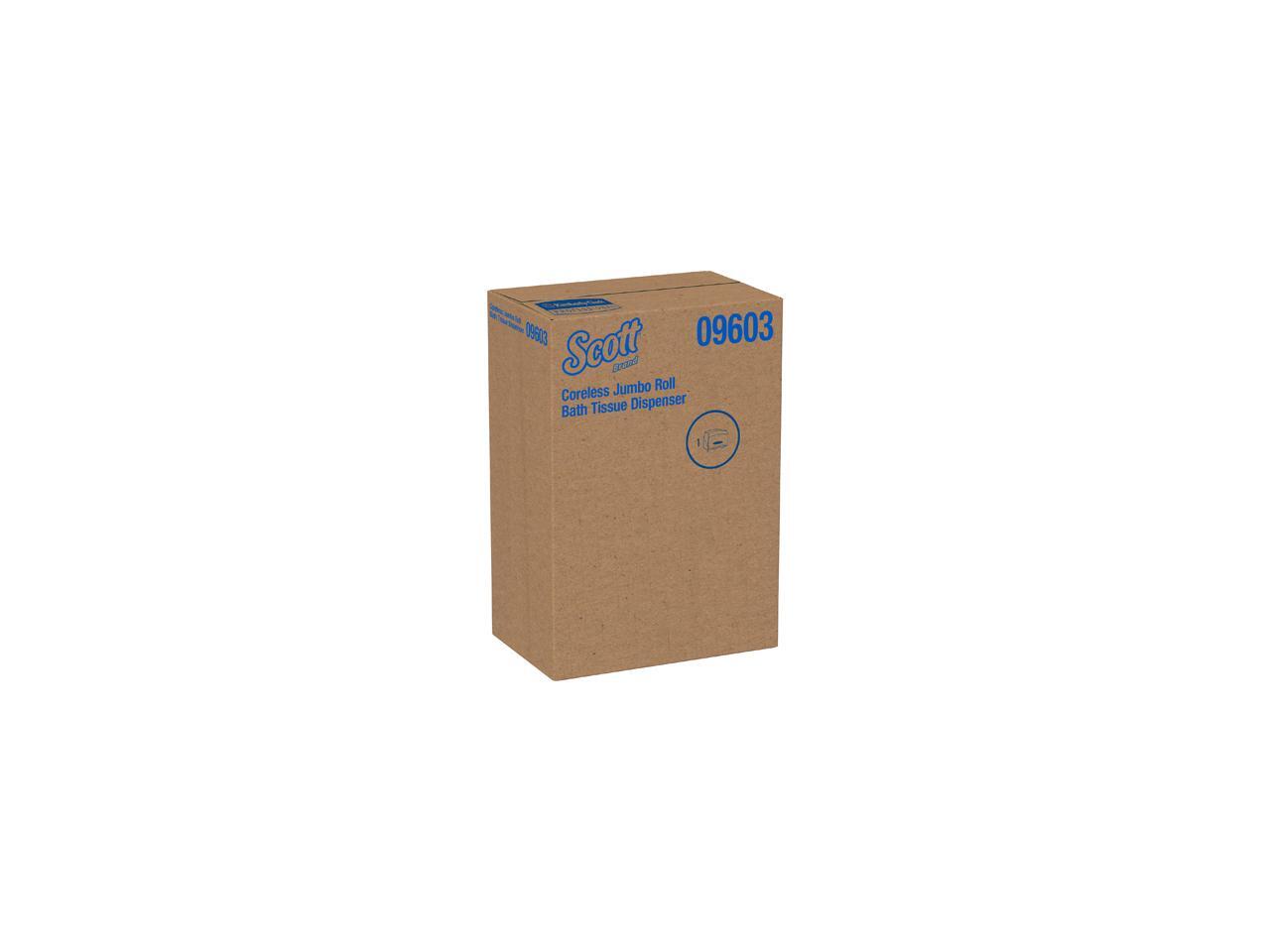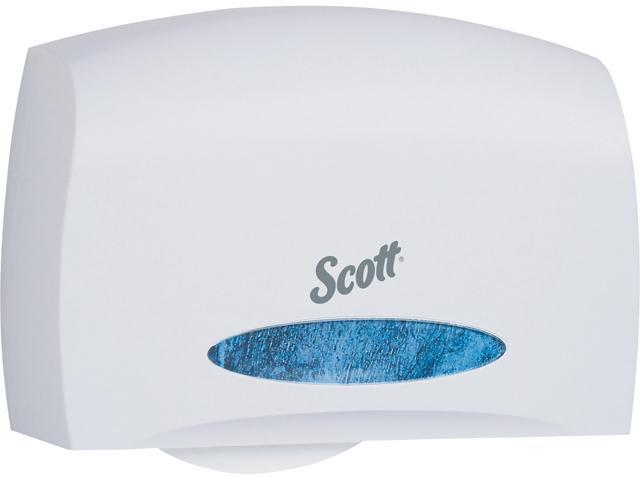 The high-capacity ScottEssential Coreless Toilet Paper Dispenser (in White) accepts compatible coreless JRT rolls; measures 14.25" x 9.75" x 6"