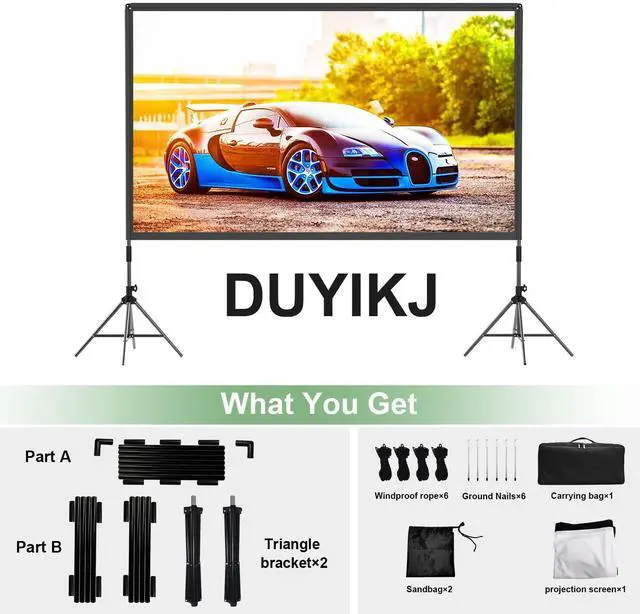 DUYIKJ outdoor movie screen is designed for providing high-resolution images, enriched colors and supreme watching experience.The outside movie screen and stand will become your best friend with the projector. Our portable movie screen is designed to provide clear,