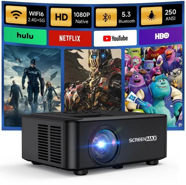 Projector with WIFI and Bluetooth, Native 1080P Bluetooth Projector, Full HD Portable Outdoor Movie Projector with Built-in Speaker, Compatible with Smartphone, HDMI, USB, Fire Stick for Home Cinema