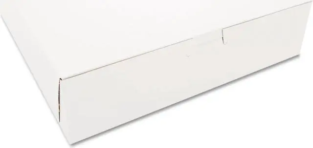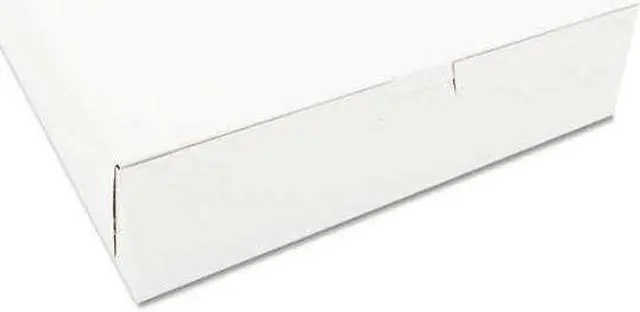 The bakery box is made from high quality paperboard that is white on the outside and Kraft on the inside. Perfect for cakes, pastries, pies and cupcakes. The white, clay-coated exterior accepts a printed logo or business name. Each one-piece box ships flat for transport and storage, but assembles easily into a folded carton with lock-corner closures and a tuck top to secure contents. Food Container Type: Box; Material(s): Clay-Coated Paperboard; Food Container Material Type: Paper; Color(s): White.