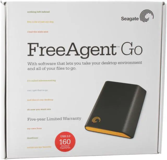 The Seagate FreeAgent Go data mover drive offers 160 GB of storage in a package smaller than a hardback novel! It's ideal for professionals whose jobs require that they work on a variety of different computers. Take your own desktop environment with you, including web browser favorites, passwords, IM client and contacts, email client, cookies, settings and files, and save all your data directly to the FreeAgent, not on the computer you're using: you'll leave no trace of your session on the computer.