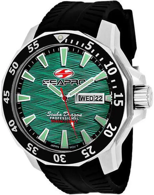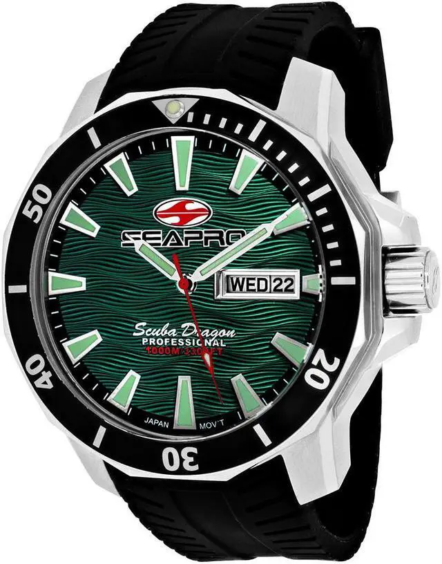 Stainless steel case with Helium Valve, Silicone strap, Green dial, Quartz movement, Scratch resistant mineral, Water resistant up to 100 ATM - 1000 meters - 3300 feet
