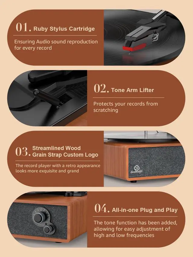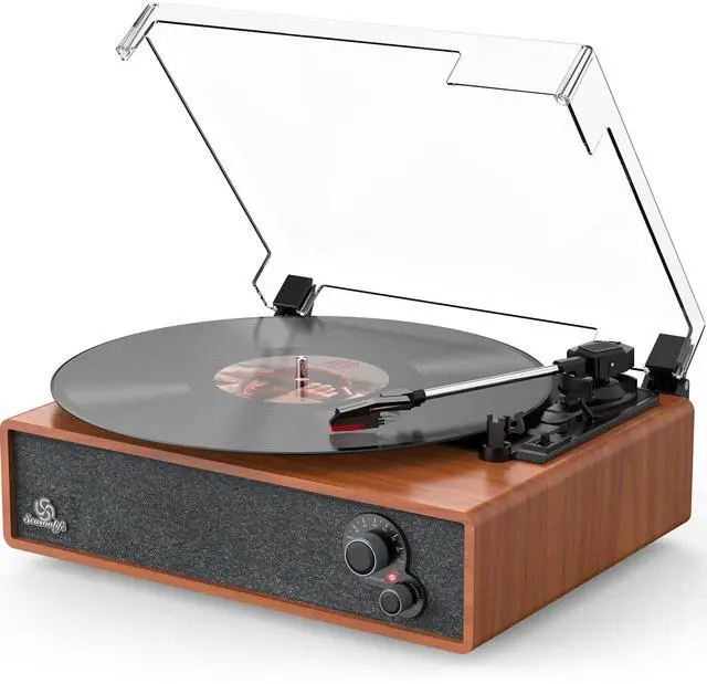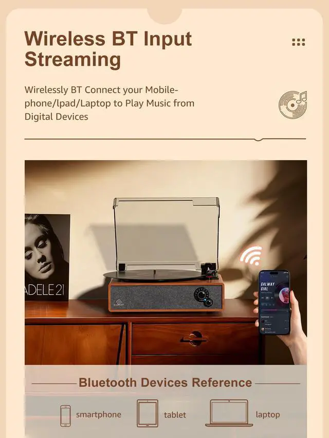 Record player with Bluetooth receiver(Bluetooth input), Auto stop, Dust cover, Vintage looking, Newly designed turntable with tone adjustment for treble and bass control, Three operating speeds: 33?, 45, 78 RPM, Built-in stereo speakers, Anti-vibration belt-driven system, RCA Line Out