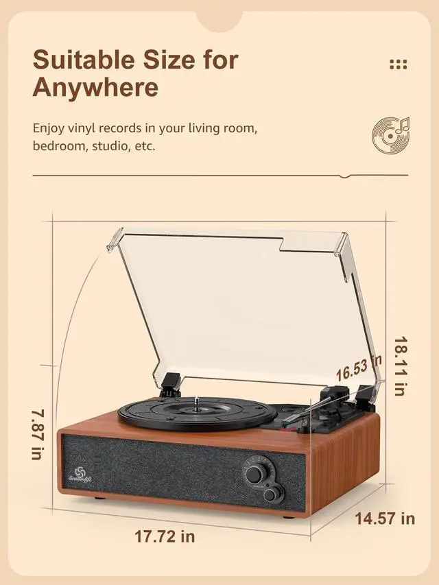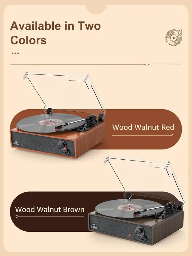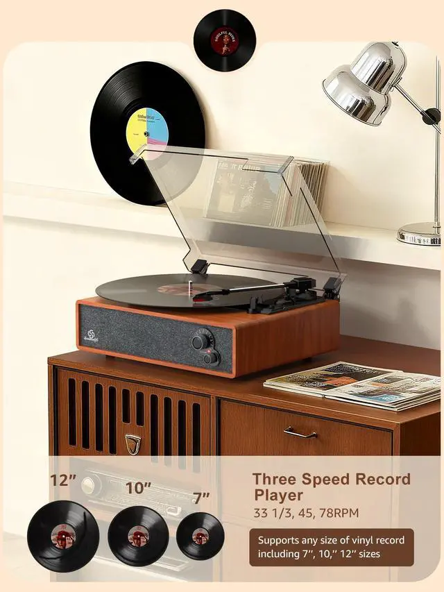 [3 Speed Options&Auto Stop] - Three speed record player play all of your 33, 45, 78 RPM vinyl records(7", 10"& 12" vinyls), 45 RPM adaptor included. Auto-stop function setting makes it possible to stop automatically when it reaches the end of the record, better protect your records. The detachable hinged dust cover protects your record when not in use, and it would not affect the playback when you close it