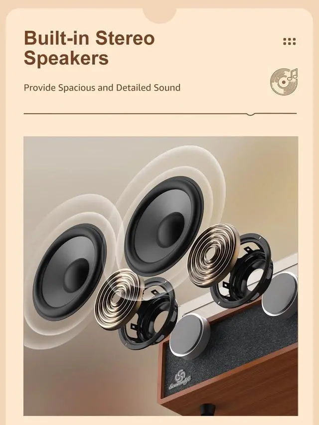 [Vintage Exquisite Looking Style] - Enjoy your favorite vinyl with this vintage-looking turntable. The minimalism, retro design of this record player makes for a stunning and functional turntable. Built from MDF materials with a unique sense of layering. The streamlined corner design is truly atmospheric and stylish (Note: long hold the start button to turn the power on, and press again to select mode)