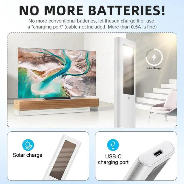 Remote control uses solar charging technology, combined with a built-in rechargeable battery, and supports USB Type-C interface charging, which effectively solves the problem of frequent battery replacement in traditional remote controls and greatly improves the convenience of use and environmental protection. When charging normally, the indicator light on the remote control will light up to show the charging status, ensuring that users can intuitively understand the power information