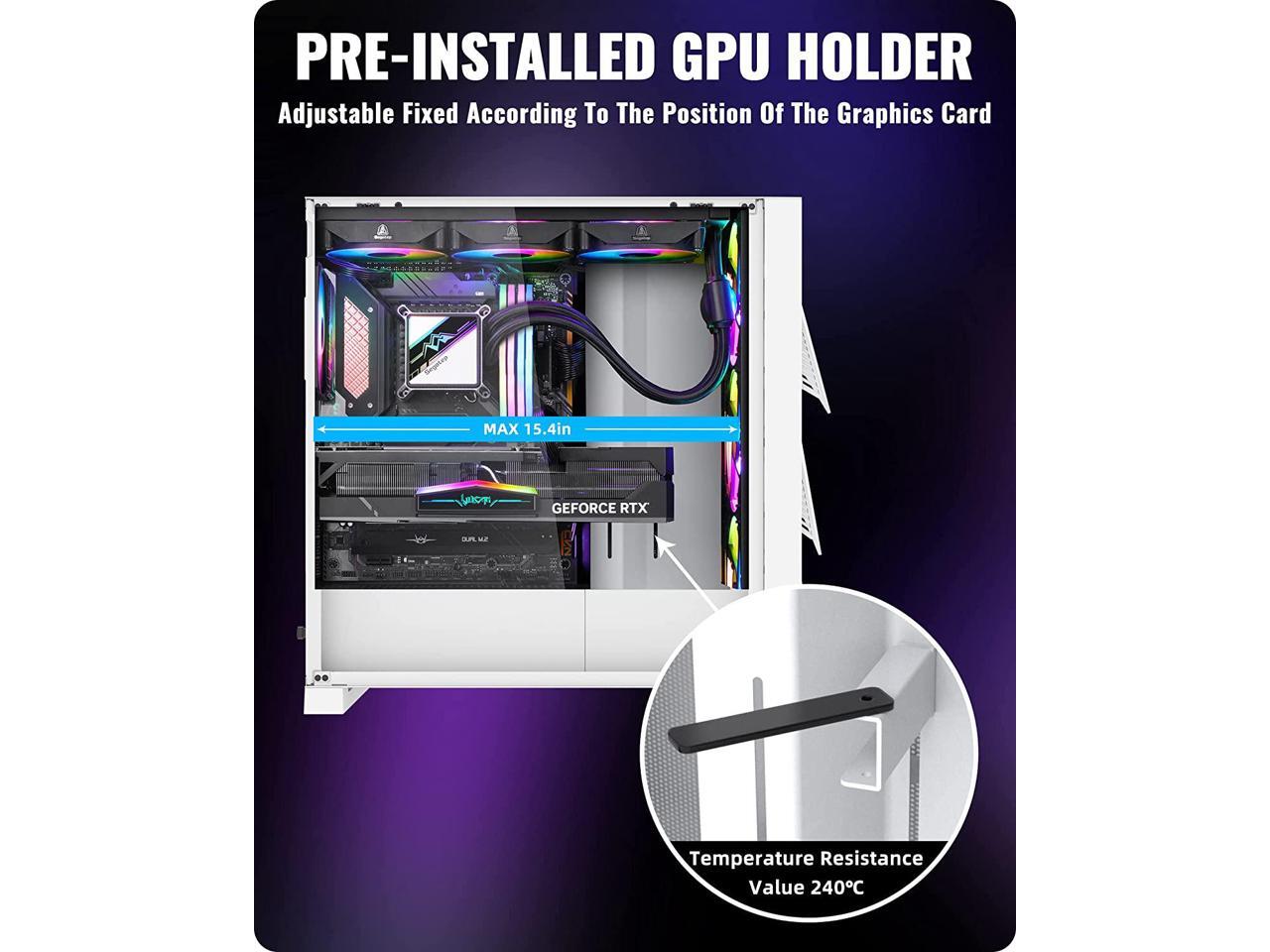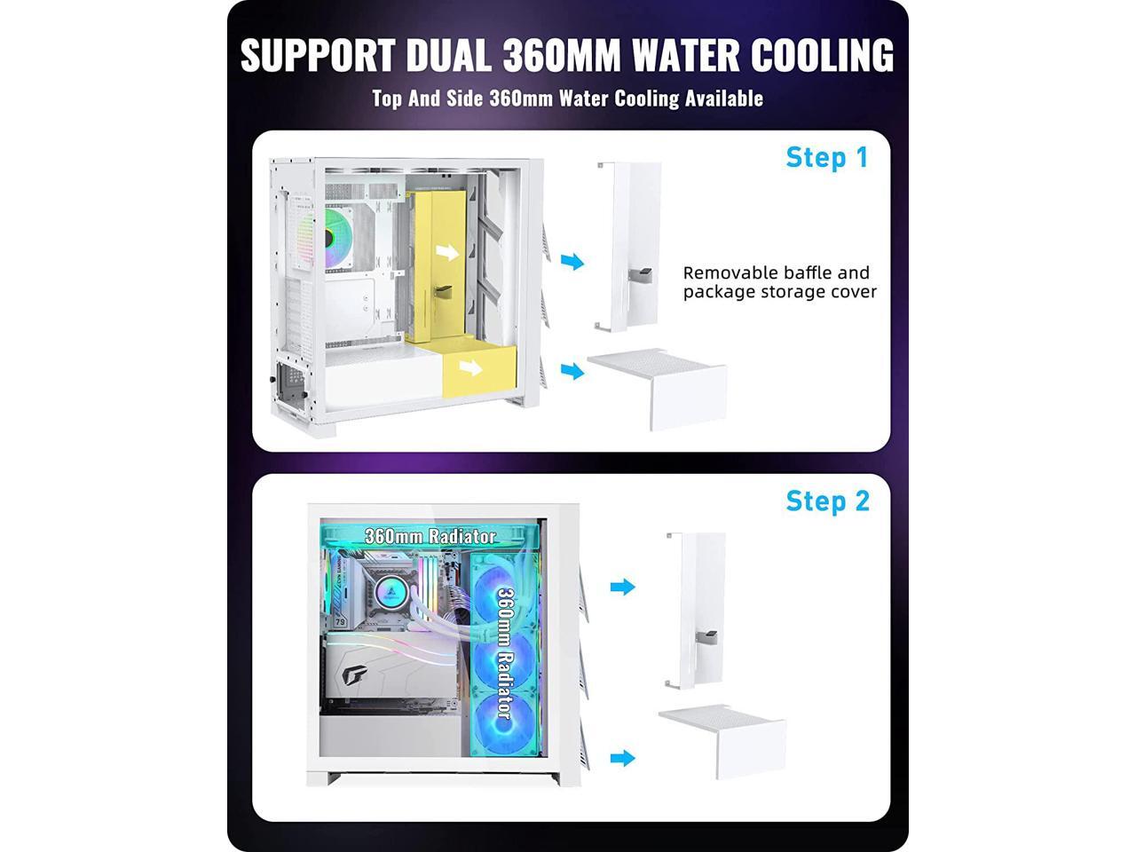 - SUPPORT DUAL 360MM WATER COOLING Our white ATX computer case allows for the simultaneous installation of dual 360mm radiators, top 360mm water cooling and side 360mm AIO liquid cooled gpu. PC gaming case can supports up to 13 fans for best temperature performance.