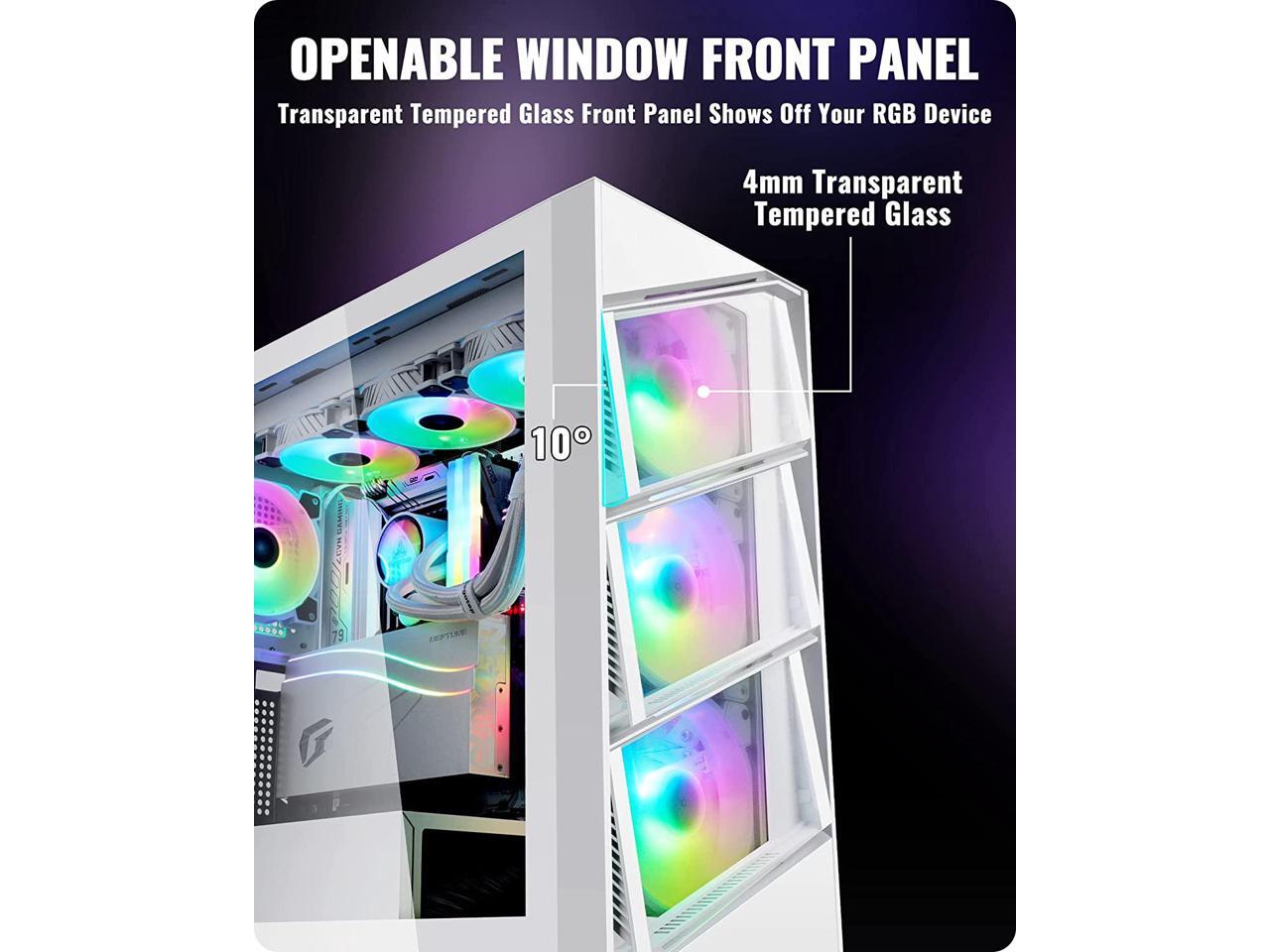 - SNAP-ON OPENING AND CLOSING FRONT PANEL White pc gaming case shows off your high profile components and RGB lighting by tempered glass side panels and snap-on opening and closing front panel. 10° smart panel air duct design can provides ample airflow. 1 pre-installed ARGB fan can offers 16.8 million colors for excellent customizable lighting.