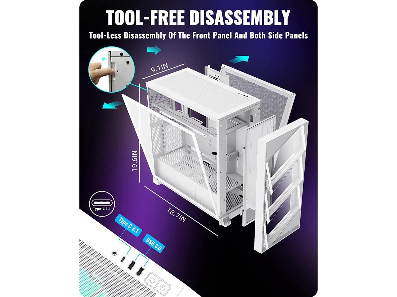 - TOOL-FREE DISASSEMBLY The modular design of our mid-tower pc case allows for tool-free disassembly. Allows you to achieve different thermal layouts by tool-free removal of the front panel, snap-on side panels, baffl