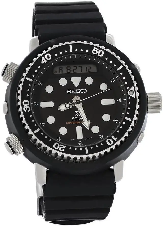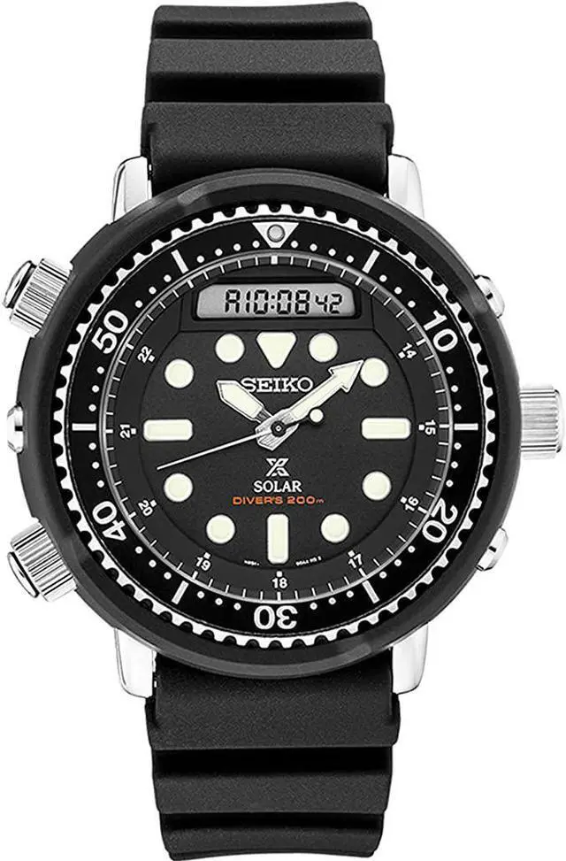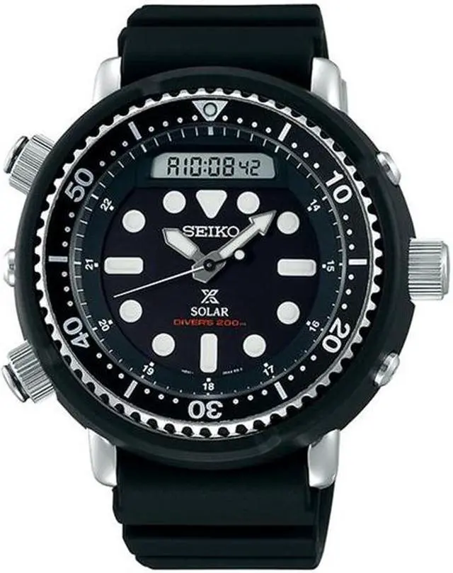 This iProspex Divers Solar SNJ025 watch is a reissue of a cult classic originally known as the Seiko H558 watch that was first introduced in 1982. At the time, it was considered the worlds first hybrid diver watch. But, it was also famous for being the exact watch Arnold Schwarzenegger personally owned and wore in many of his 1980s movies including Commando and The Predator. So, this new model has been nicknamed, the Seiko Arnie watch as part of the Prospex Divers collection which follows closely the same design style as its early counterpart.