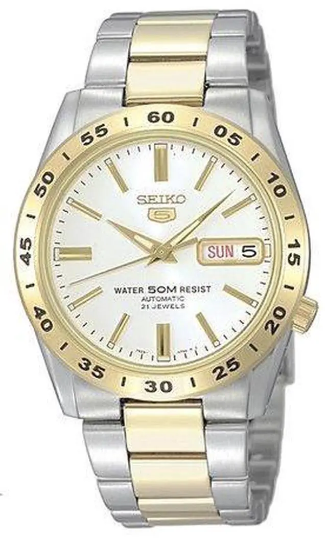 Man's watch. Automatic quars movement. Golden plated stainless steel and stainless steel case and bracelet. White dial with calendar. Water resistant 50m. Mineral crystal. Warranty of 2 years. Diameter 37mm.