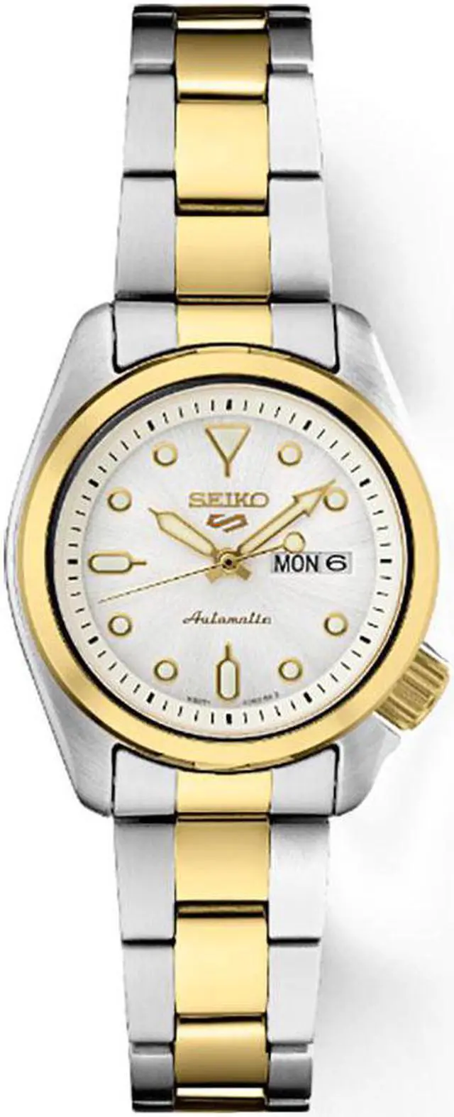 Seiko 5 Sports Collection Vintage, street-smart style in a new smaller case This classic timeless women's sports watch is water-resistant to 10 bar, 100 meters (330 feet) and has a stainless steel case and bracelet