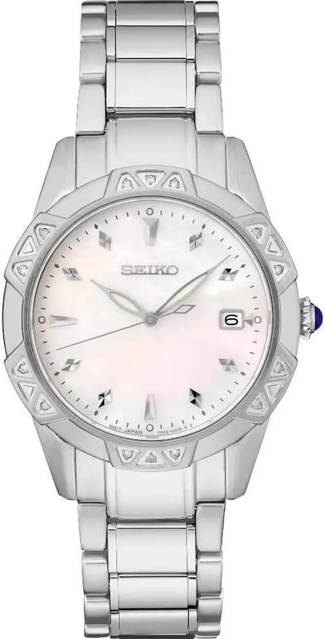 The Seiko Diamond Series is an affordable, elegant and luxurious timepiece collection for men and woman featuring real diamonds. The ladies' Seiko SKK727 quartz timepiece has a 33.2 mm stainless steel case with date window within the 3 marker and white dial visible behind a scratch resistant anti-reflective sapphire crystal. Set within the stainless steel bezel is pyramid shaped accents encrusted with 14 genuine diamonds. A minutes track surround silver indices, with luminous leaf shaped hands for clean visible readability. Equipped with blue jewel tipped cabochon crown with 100 meter water resistance for easy grip setting.