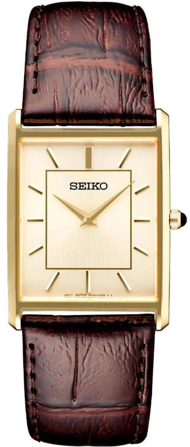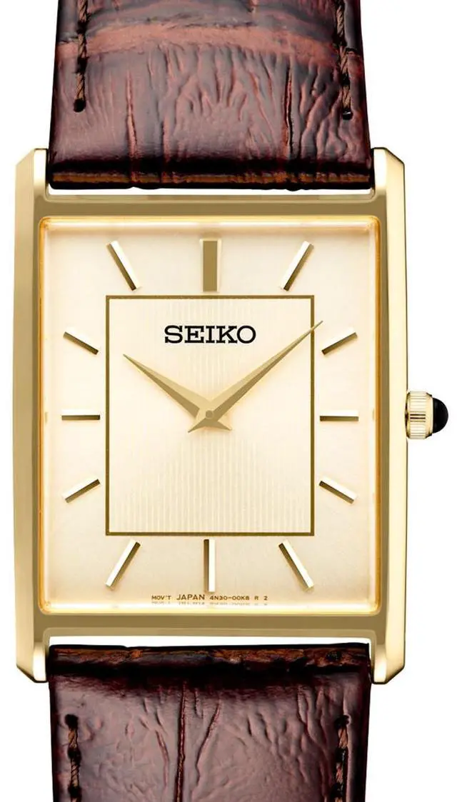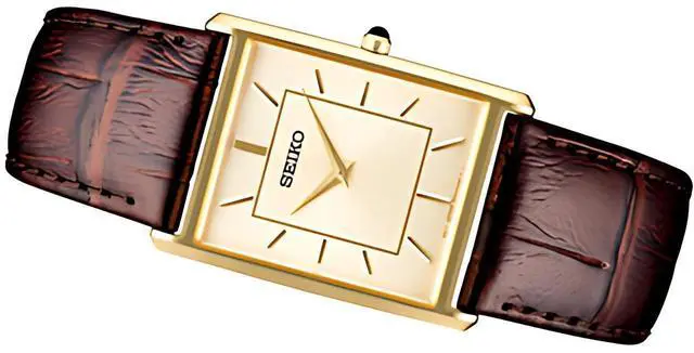 Offering classic dress/sport design, the Essentials Collection provides the ideal solution for everyday wear. Giving a new slant to a traditional rectangular style with a subtly patterned light champagne sunray dial, this perfectly tailored watch features a stainless steel case in gold finish, cabochon crown and textured brown leather strap. 3 bar, 30M Water Resistant.